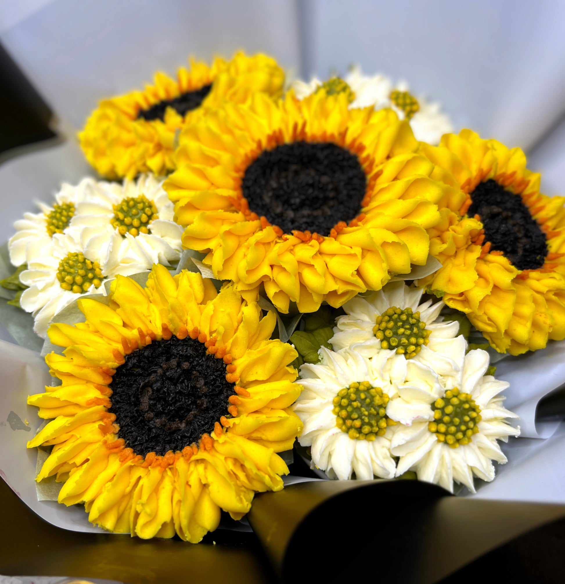 A summer bouquet of sunflowers and daisies. Hand-piped to order this bouquet is sure to raise a smile!
